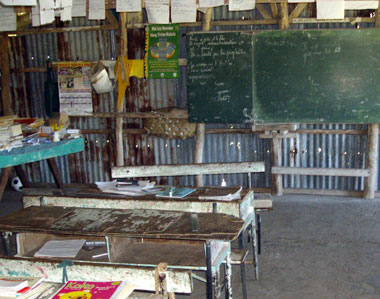 Nous arrivons enfin à l'école. C'est l'heure de manger et les enfants ne sont pas dans la classe que nous visitons tranquillement. Le moins que l'on puisse dire c'est que c'est rustique. Le tableau noir est cloué sur les bambous qui supportent les tôles ondulées des murs brulants de soleil . Les petits bureaux et les bancs sont tous rafistolés, pas un ne repose sur ses 4 pieds.