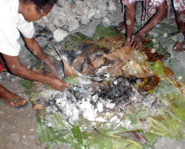 pierres très chaudes puis on recouvre le tout avec d'autres