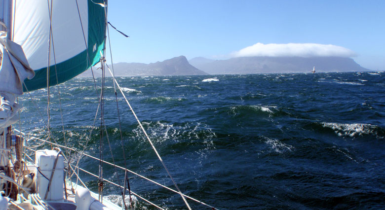 Je navigue maintenant dans False Bay en direction de Simon's town. En face de moi, derrière le phare blanc qui balise des hauts fonds rocheux, s'élève la fameuse montagne de la Table dont le sommet est parfaitement horizontal et qui surplombe la ville de Capetown. Pas de chance pour moi, aujourd'hui elle est encapuchonnée de son nuage blanc. J'aurai d'autres occasion de la voir.