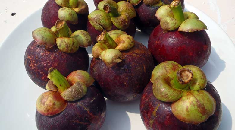 Le mangoustan: Commençons par notre préféré, le mangoustan qui est aussi appelé la reine des fruits ou encore fruit des dieux. C'est vraiment un fruit délicat et savoureux. Natif de Malaisie, des Iles de la Sonde et des Moluques, le mangoustanier est un bel arbre au tronc droit qui peut mesurer de 6 à 25 mètres de haut. Il lui faut 30 ans pour atteindre cette taille. Il donne ses premiers fruits après 20 ans. Ses feuilles sont de couleur vert brillant dessus et jaune-vert dessous. Ses fleurs ont de grands pétales verts, jaunâtres, teintés de rouge. Son fruit, le mangoustan en français, mangosteen en anglais, mankoute en thaïlandais et manggis en malaisien, est arrondi, violacé, de la taille d’une balle de golf ou de tennis pour les plus gros. Après la cueillette, il durcit et fonce. En Malaisie on le récolte de juillet à septembre. Le fruit possède une épaisse écorce lisse vert-jaunâtre devenant pourpre foncé à maturité. Cette grosse peau décourage l’invasion des insectes sur près de deux centimètres, donc il n’est pas nécessaire d’employer d’insecticide.